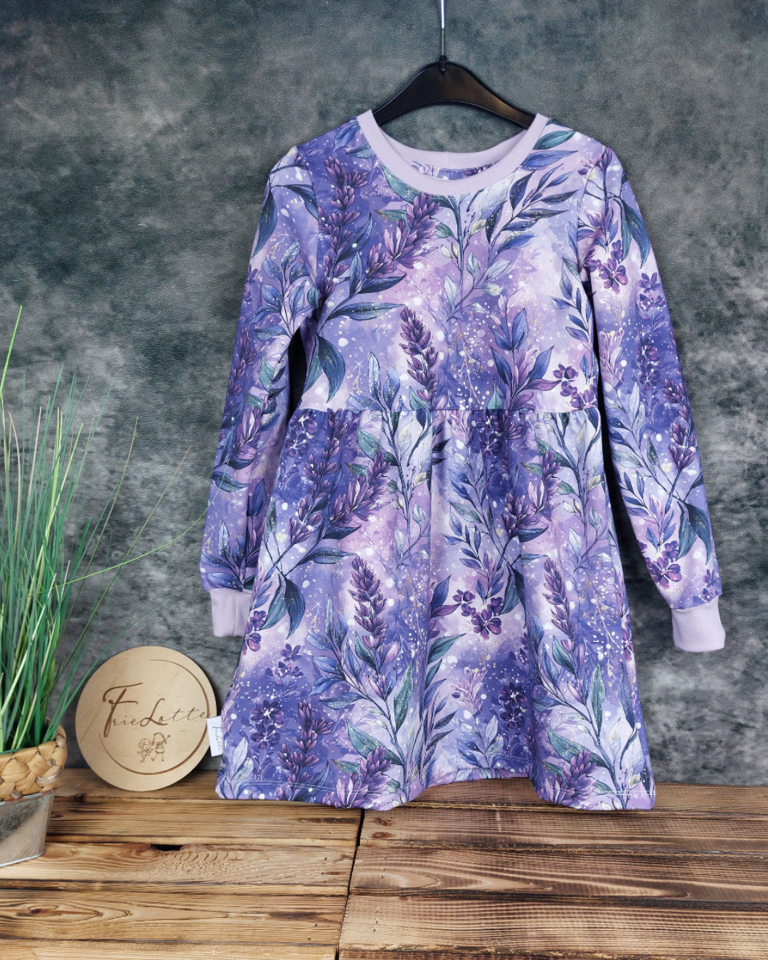 Weiches Basickleid aus hochwertigem French Terry mit charmanten Lavendelblüten-Motiven in zarten Lilatönen. Das ausgestellte Rockteil sorgt für angenehme Bewegungsfreiheit und eine schmeichelnde Silhouette. Der fließende Stoff liegt sanft auf der Haut und bietet maximalen Tragekomfort für den Alltag. In deiner Wunschgröße erhältlich.