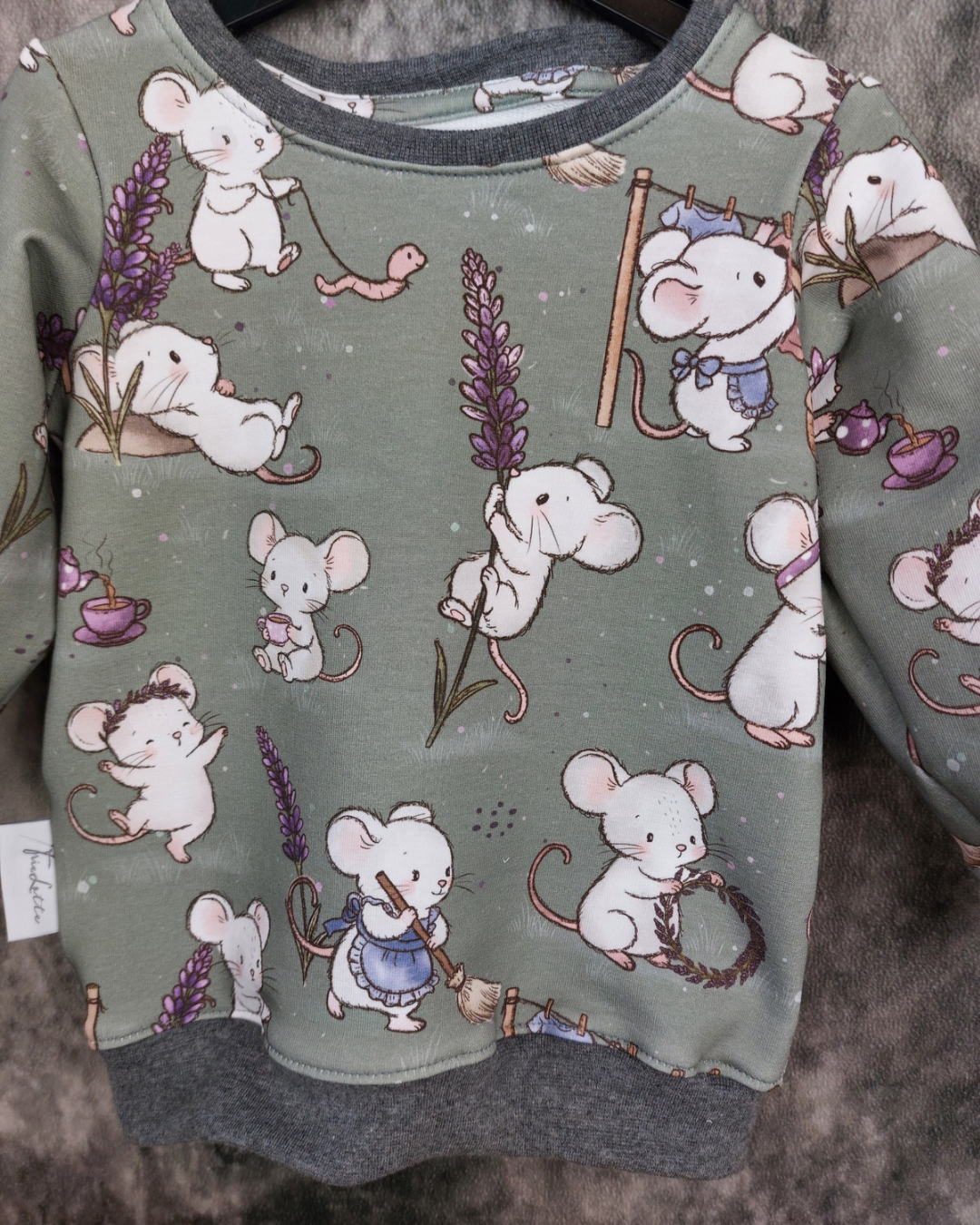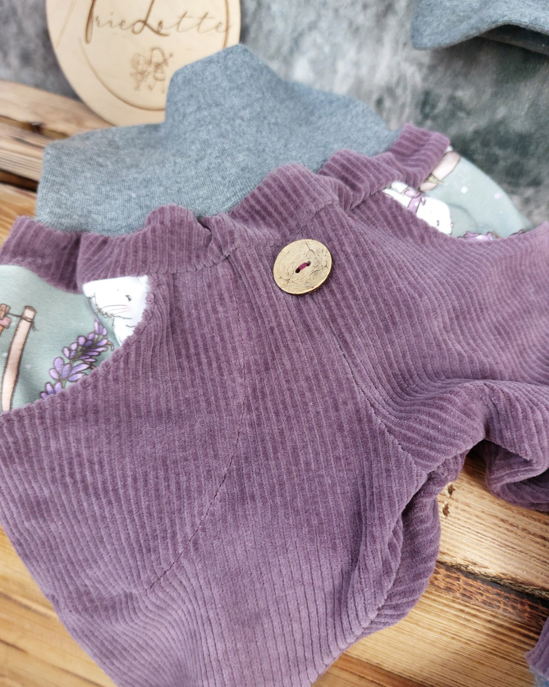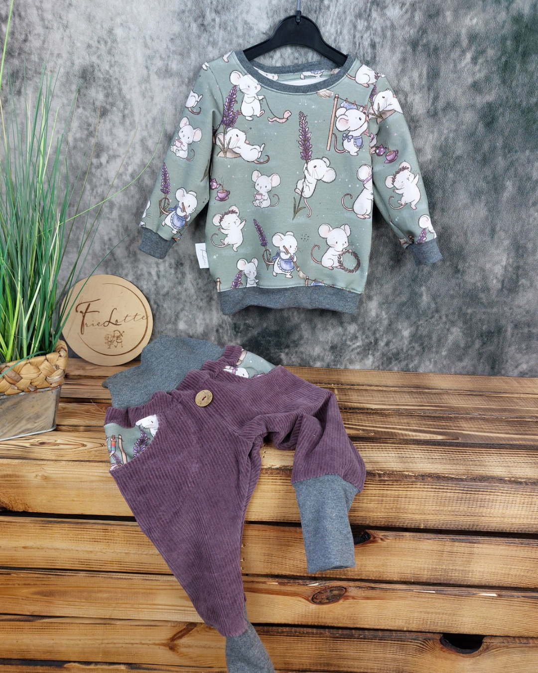 Set bestehend aus Sweater mit Mäusen in grün und passender Hose mit Taschen aus Cordjersey in lila.