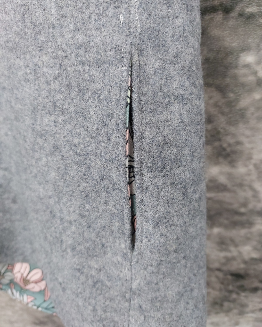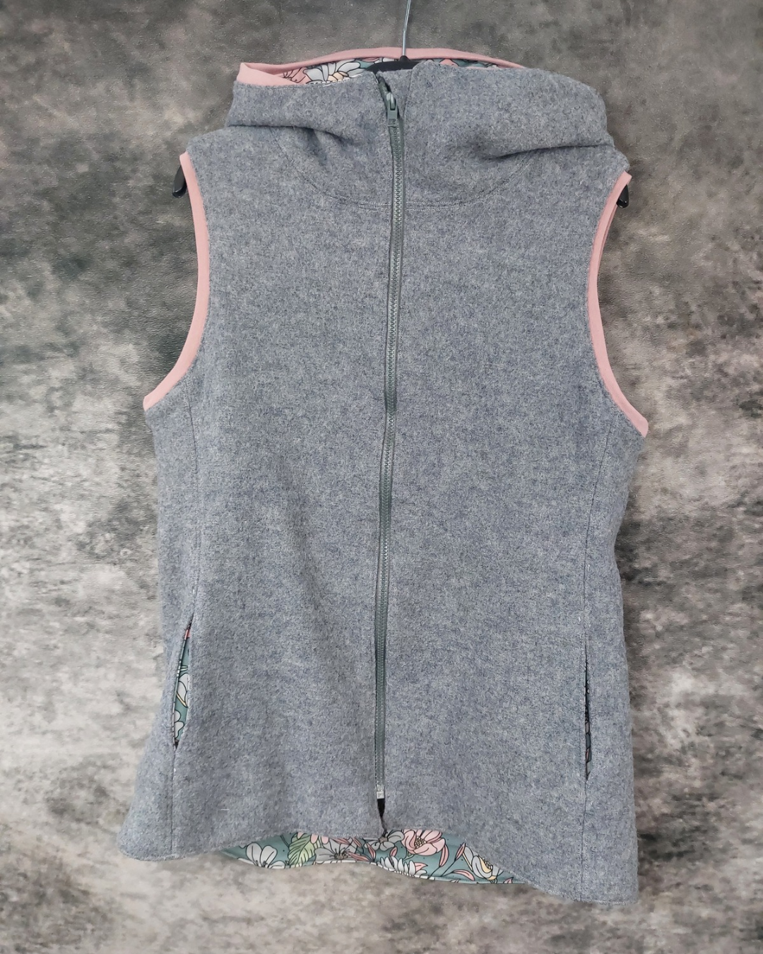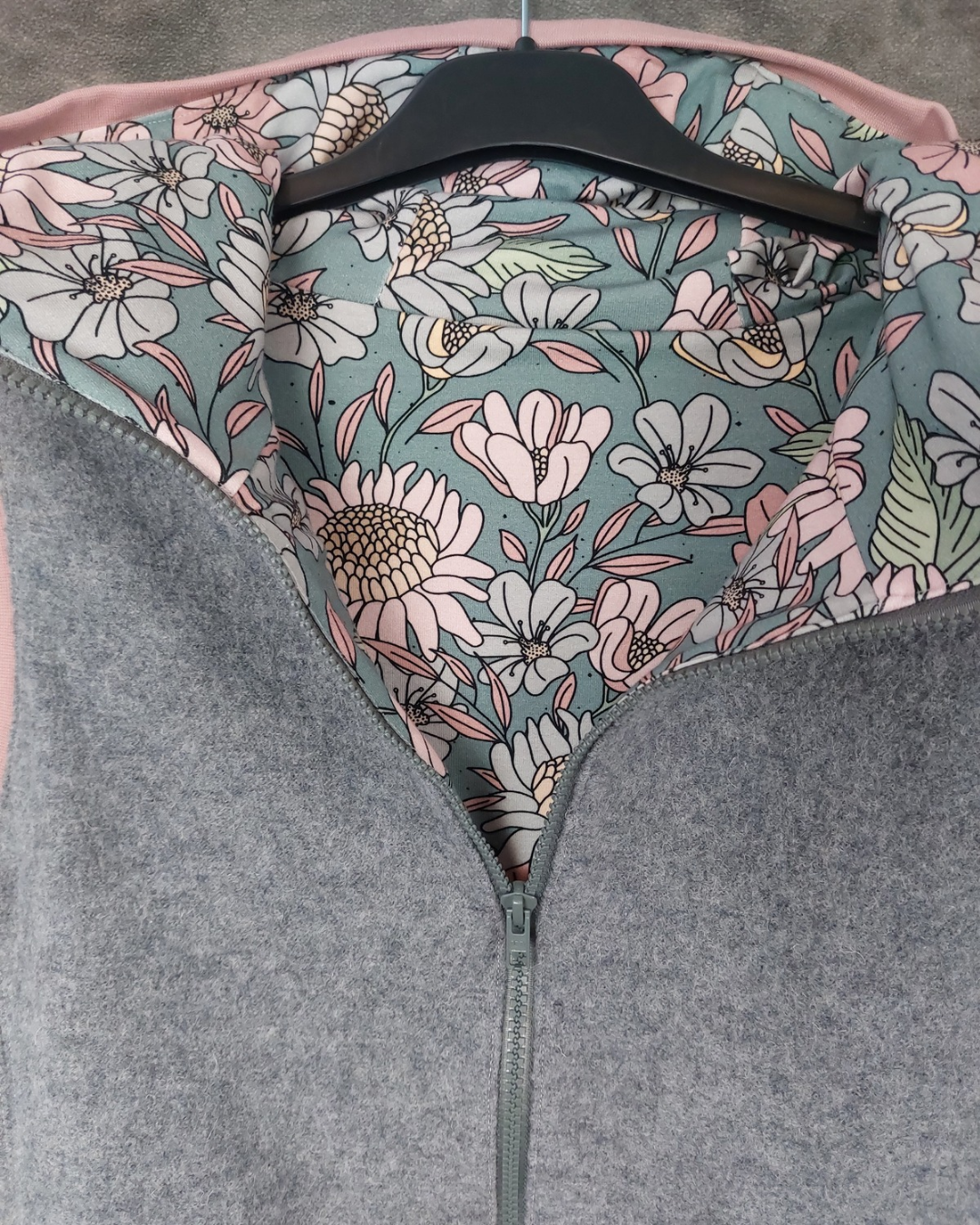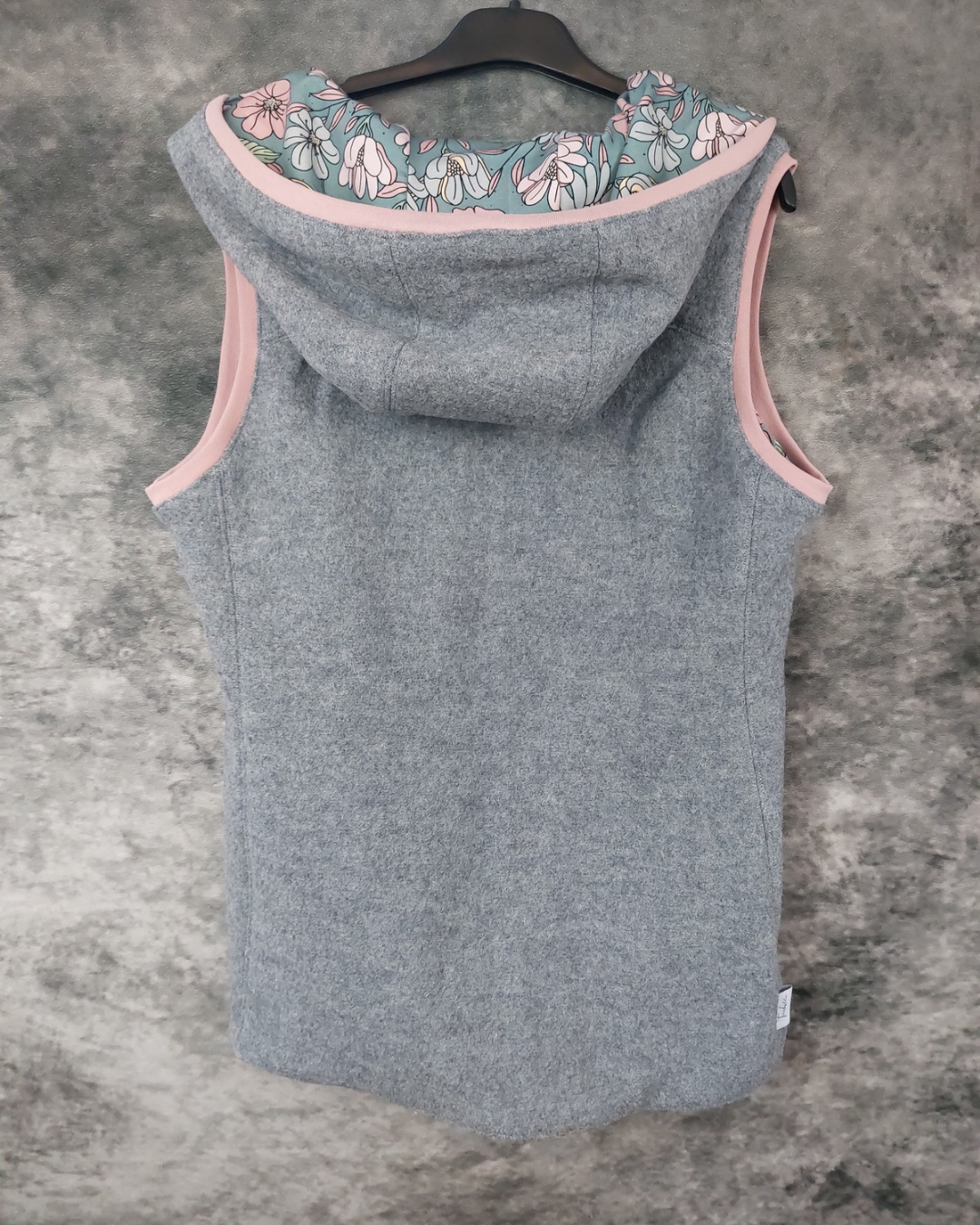 Walkweste in grau in Gr. 38 mit Kapuze und Innenfutter aus Jersey. Die Bündchen sind rosa und das Innenfutter hat ein florales Muster.